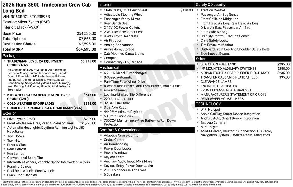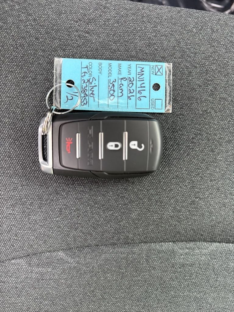 Designed for diesel-powered dominance, our 2026 RAM 3500 Tradesman Crew Cab 4X4 delivers dynamic capability in Silver Zynith! Motivated by a TurboCharged 6.7 Liter High Output Cummins Diesel 6 Cylinder providing 370hp and 1075lb-ft of torque to an 8 Speed Automatic transmission for work-ready muscle. An anti-spin rear differential and HD shocks are standard for sure-footed performance when handling big loads, and this Four Wheel Drive truck blends that bold power with proud style. Our RAM 3500 is smartly equipped with LED lighting, fog lamps, telescoping trailer mirrors, and a Class V hitch receiver.