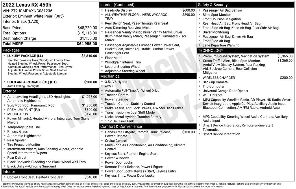 2022 Lexus RX 450h AWD 3.5L V6 DOHC VVT-i 24V eCVT 4D Sport Utility White Pearl