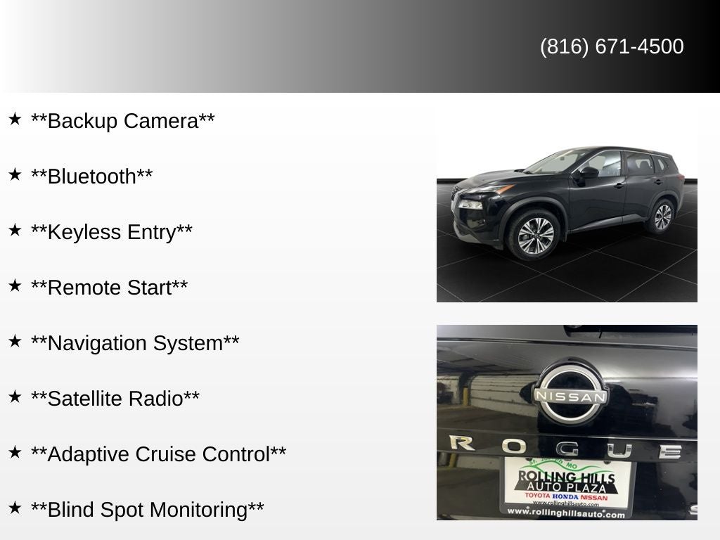 **Backup Camera**, **Bluetooth®**, **Keyless Entry**, **Remote Start**, **Navigation System**, **Satellite Radio**, **Adaptive Cruise Control**, **Blind Spot Monitoring**, **Home Delivery Available**, **Power Door Locks**, **Power Windows**, Rogue SV, 4D Sport Utility, AWD, Super Black, Charcoal Cloth.