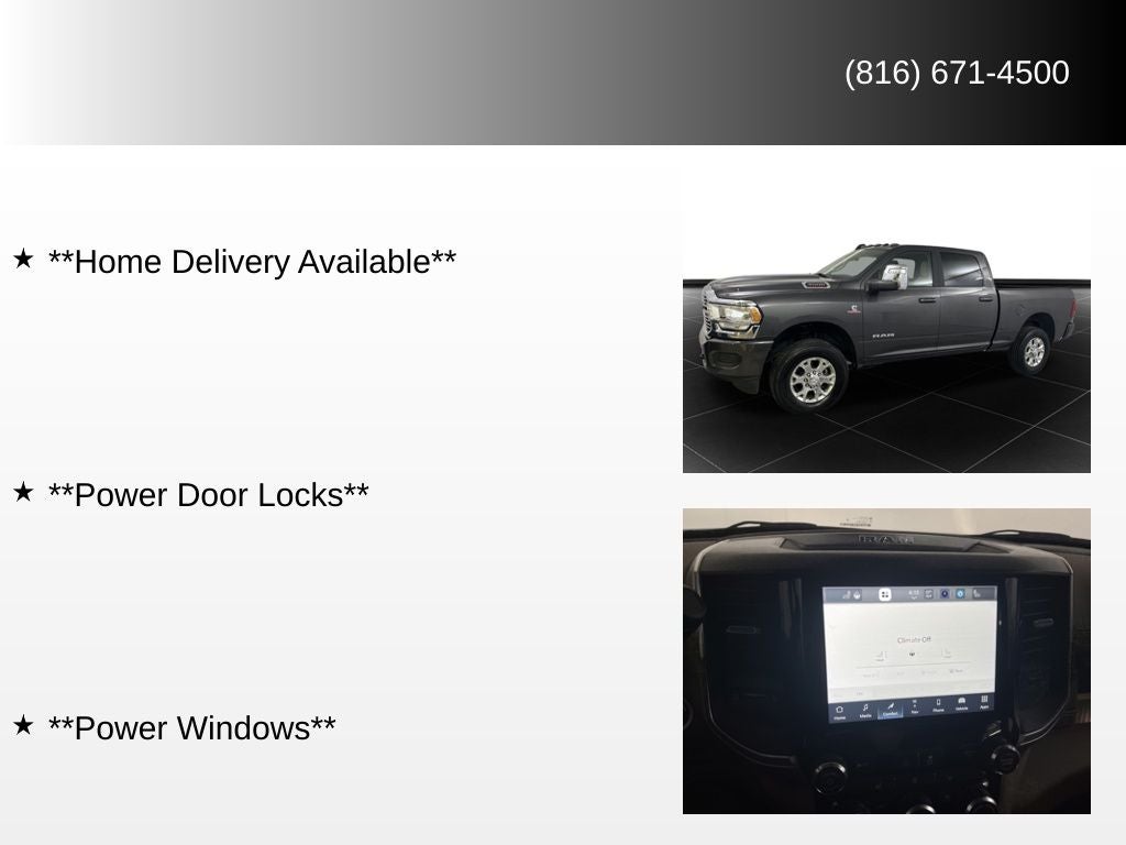 **Backup Camera**, **Bluetooth®**, **Keyless Entry**, **Remote Start**, **Heated Seats**, **Navigation System**, **Satellite Radio**, **Adaptive Cruise Control**, **Home Delivery Available**, **Power Door Locks**, **Power Windows**, 3500 Laramie, 4D Crew Cab, 4WD, Granite Crystal Metallic Clearcoat, Lt Frost Beige/Mountain Leather.