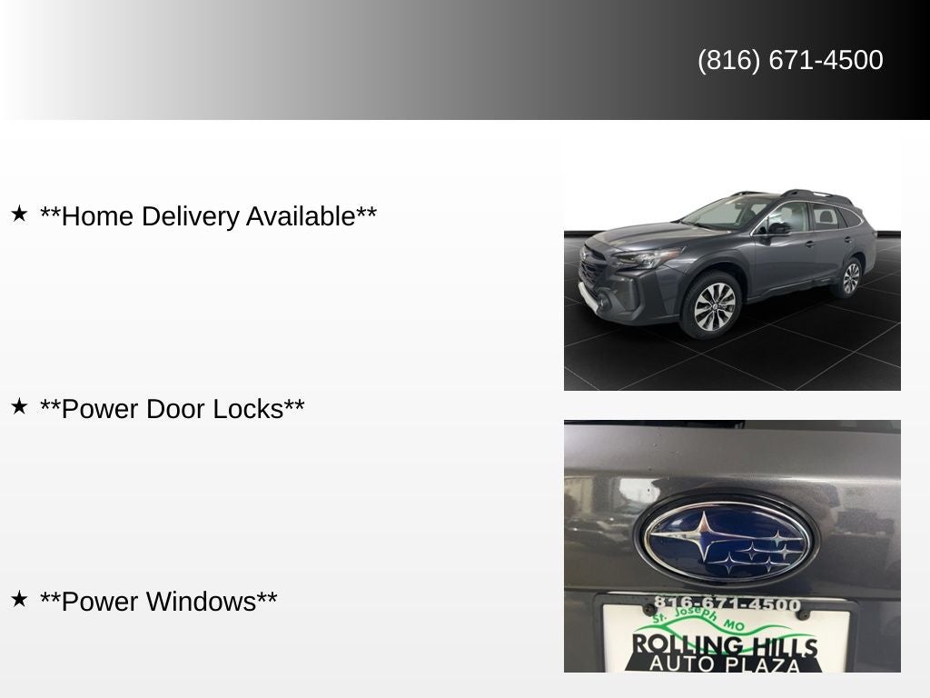 **Backup Camera**, **Bluetooth®**, **Keyless Entry**, **Heated Seats**, **Navigation System**, **Satellite Radio**, **Adaptive Cruise Control**, **Seat Memory**, **Home Delivery Available**, **Power Door Locks**, **Power Windows**, Outback Limited, 4D Sport Utility, AWD, Gray Metallic, Gray Leather.