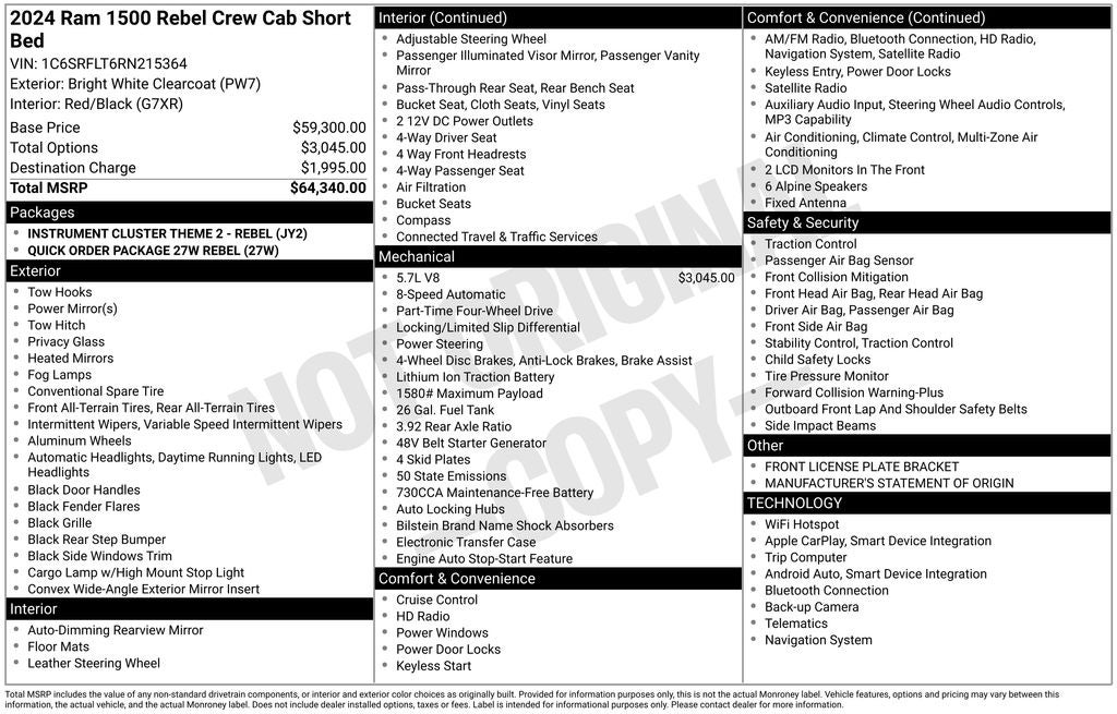 ***ONE OWNER VEHICLE***, ***ACCIDENT FREE***, ***PASSED 120 POINT INSPECTION***, ***APPLE CAR PLAY / ANDROID AUTO***, ***CRUISE CONTROL***, ***FOUR WHEEL DRIVE***, ***POWER WINDOWS***, ***POWER LOCKS***, 1500 Rebel, 4D Crew Cab, HEMI 5.7L V8 Multi Displacement VVT eTorque, 8-Speed Automatic, 4WD, Bright White Clearcoat, Black Cloth.