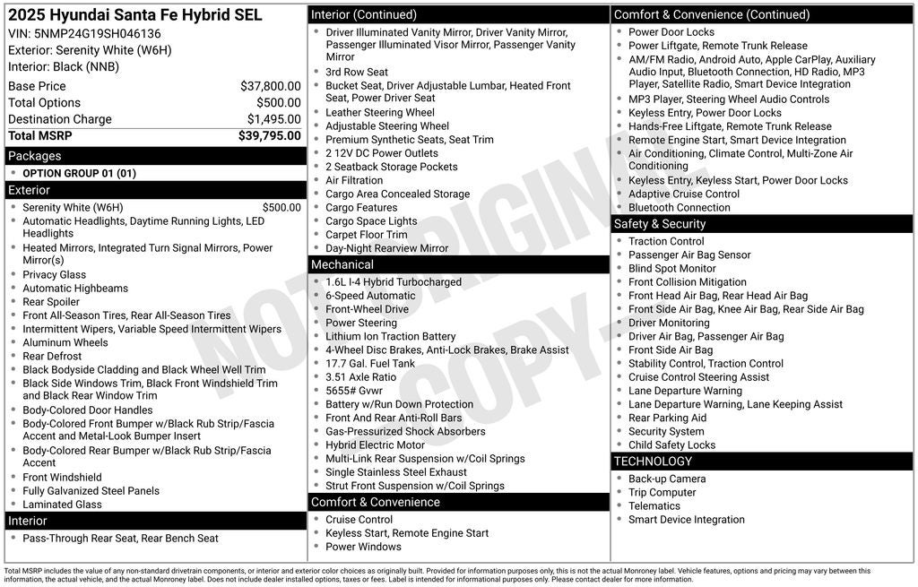 **Backup Camera**, **Bluetooth®**, **Keyless Entry**, **Remote Start**, **Navigation System**, **Satellite Radio**, **Adaptive Cruise Control**, **Blind Spot Monitoring**, **Home Delivery Available**, **Power Door Locks**, **Power Windows**, Santa Fe Hybrid SEL, 4D Sport Utility, I4, FWD, White, Black Premium Synthetic.